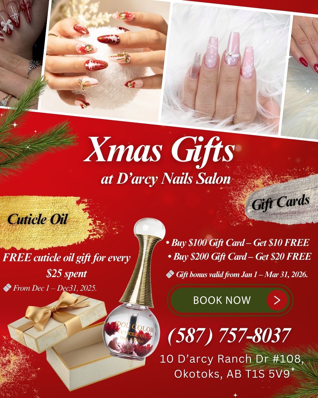 D'arcy Nails Salon is your sanctuary for relaxation and rejuvenation in the heart of Okotoks, Alberta. Our address is Unit 108, 10 D'arcy Ranch Drive, Okotoks, Alberta, T1S 5V9.